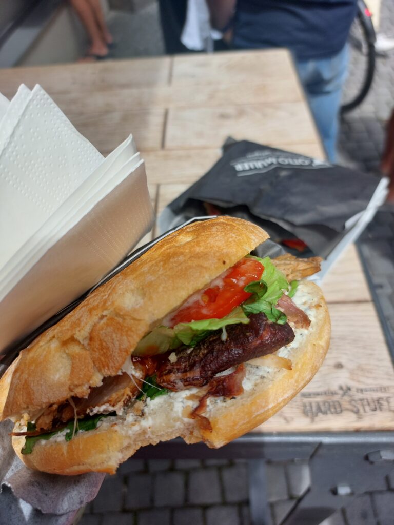 Poco più avanti abbiamo incontrato per caso il locale Otto Muller, che serve panini buonissimi, e mai scelta è stata più azzeccata! Abbiamo preso un panino con il pulled pork e due Bodensee BBQ con le polpette (attenti, perché questo è pane nero al carbone vegetale), spendendo per tre buonissimi panini e una bottiglietta d’acqua meno di 22 euro. Direi che ci è andata bene!