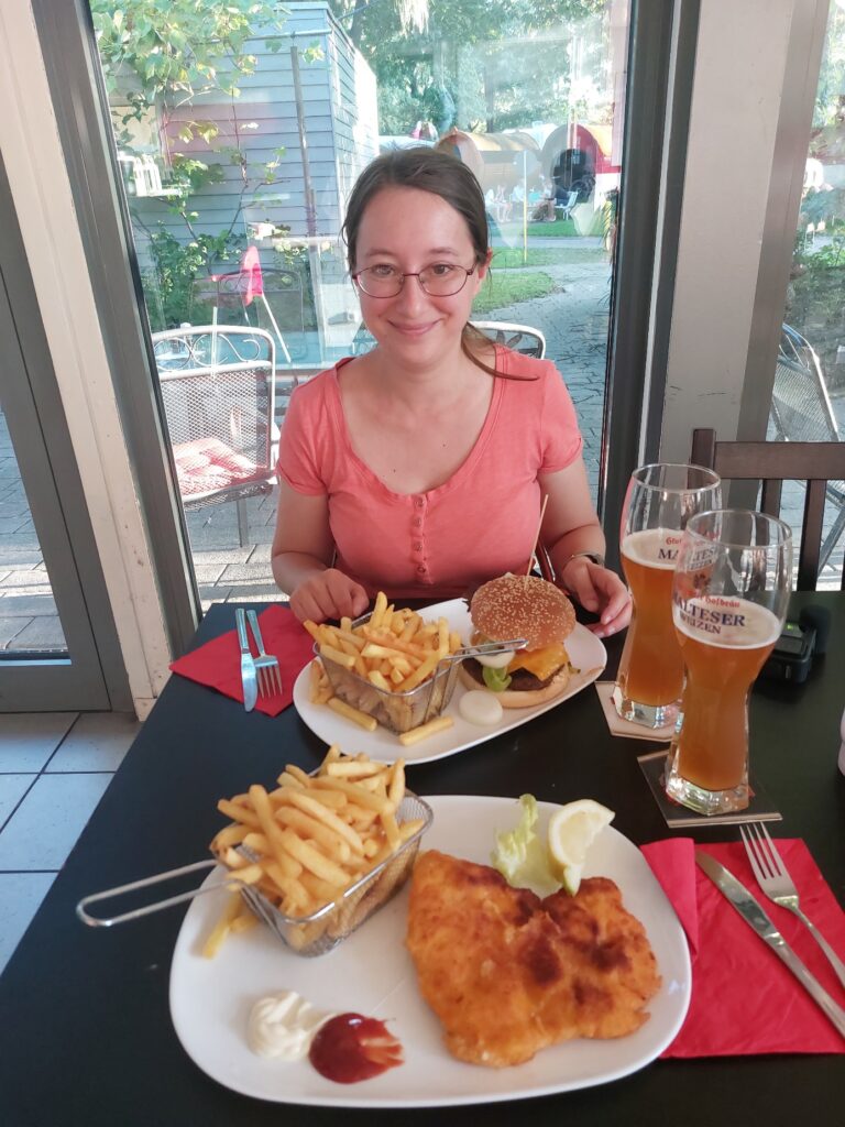 Abbiamo deciso di cenare al bistrot del campeggio e la nostra scelta è ricaduta su due birre, insalata, cotoletta e hamburger, accompagnati da patatine buonissime, per una spesa totale di 44 Euro.