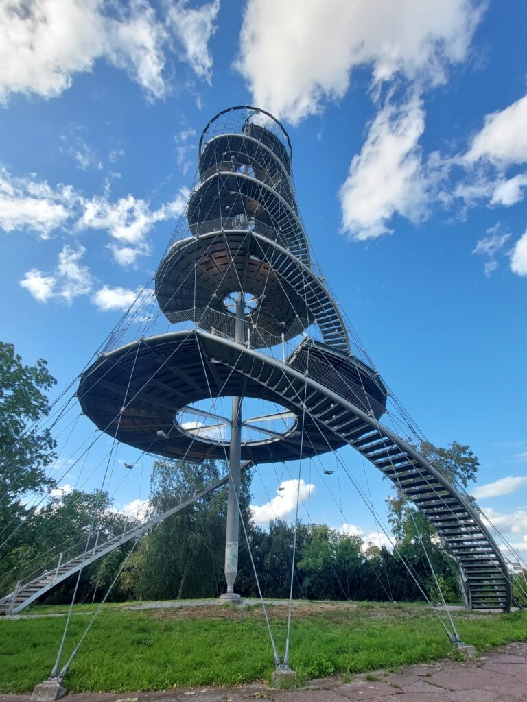 Una volta scesi abbiamo attraversato il parco e i giardini fioriti, passando anche accanto a delle installazioni con carri e tende di un circo itinerante di pagliacci, e siamo arrivati infine alla Torre Panoramica, alta 40 metri e costruita tra il 1993 e il 2001.